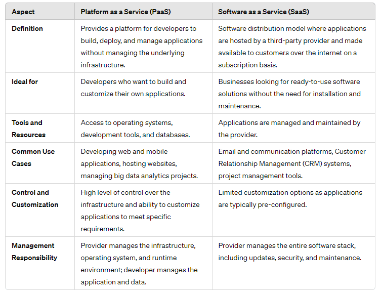 Platform as a Service (PaaS) and Software as a Service (SaaS) are cloud computing services offering distinct solutions for businesses. Here’s a detailed comparison to help you understand their differences and use cases:
